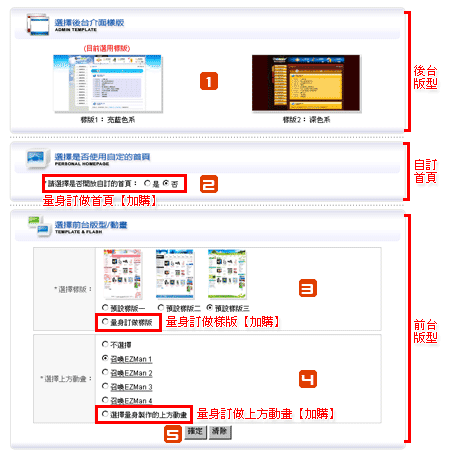 選擇前台版型:提供您幾組預設樣版,若您有另外加購版型或是量身訂做樣版,在此也會出現供您選擇。