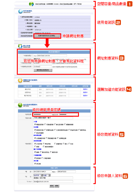 NO.3 商城資訊:在此可查詢您的商城相關資訊,並可修改商城基本資料,以及申請 詳細介紹
