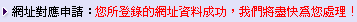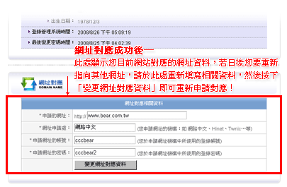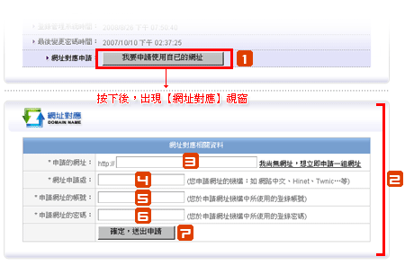 網址對應資料:若您有申請網址對應成功的話,在此會顯示網址對應資料欄框,若您日後要變更在此修改資料重新申請對應即可。(非總管理者看不到此資料)。