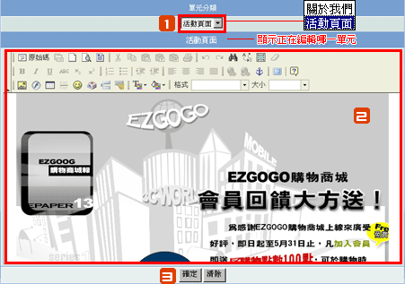 編輯內容:編輯活動頁面內容。此欄位提供您編輯器使用,善用編輯器可編輯出較活潑豐富的訊息內容。