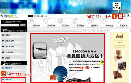 另一按鈕可設定在左側互動專區選單。此按鈕設定:請至「商城管理系統>商城資料設定>左方區塊>」在自訂互動專區選單中,將最新活動勾選即可。