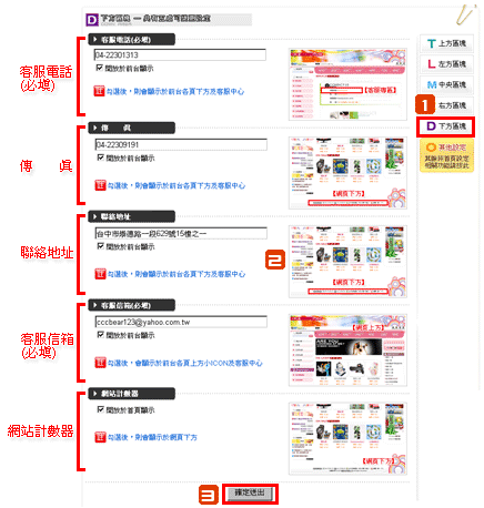 可設定【客服電話】【傳真】【 聯絡地址】【客服信箱】【網站計數器】